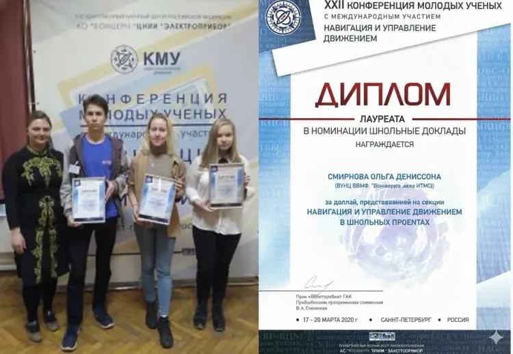 Поздравляем учеников нашей школы и их руководителей с успешным выступлением на XXII конференции молодых ученых «Навигация и управление движением», прошедшей в ГНЦ РФ АО «Концерн «ЦНИИ «Электроприбор». Лауреатами в номинации школьных докладов стали: – Лубков Максим Константинович и Гайнутдинов Марат Ринатович, руководитель Абрамкина Кристина Вадимовна. – Смирнова Ольга Денисовна, руководитель Болдырева Елена Александровна.